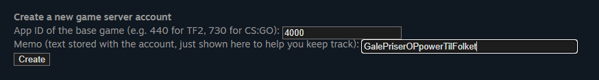 Du går inn på steam sine nettsider, og finner Steam Game Server Account Management. Her finner du en liten boks nederst på siden, hvor tittelen er: Create a new game server account