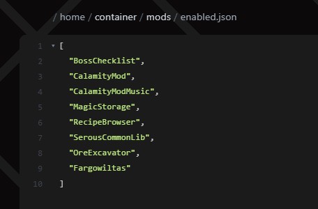 9. Inne i mods mappen finner du en fil som heter enabled.json